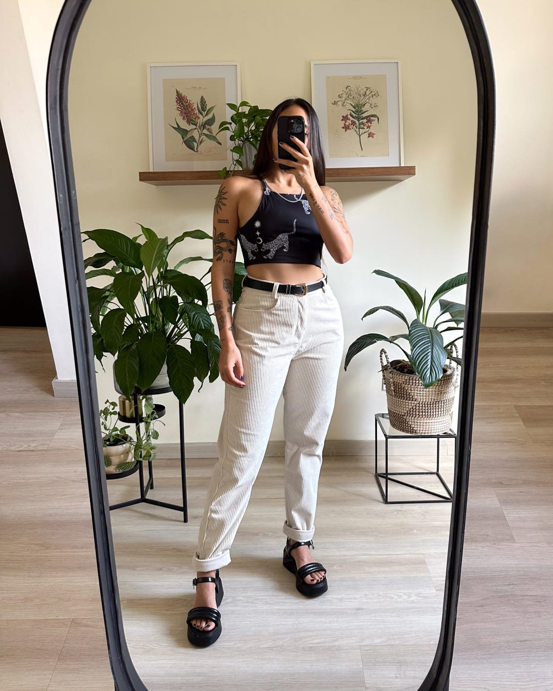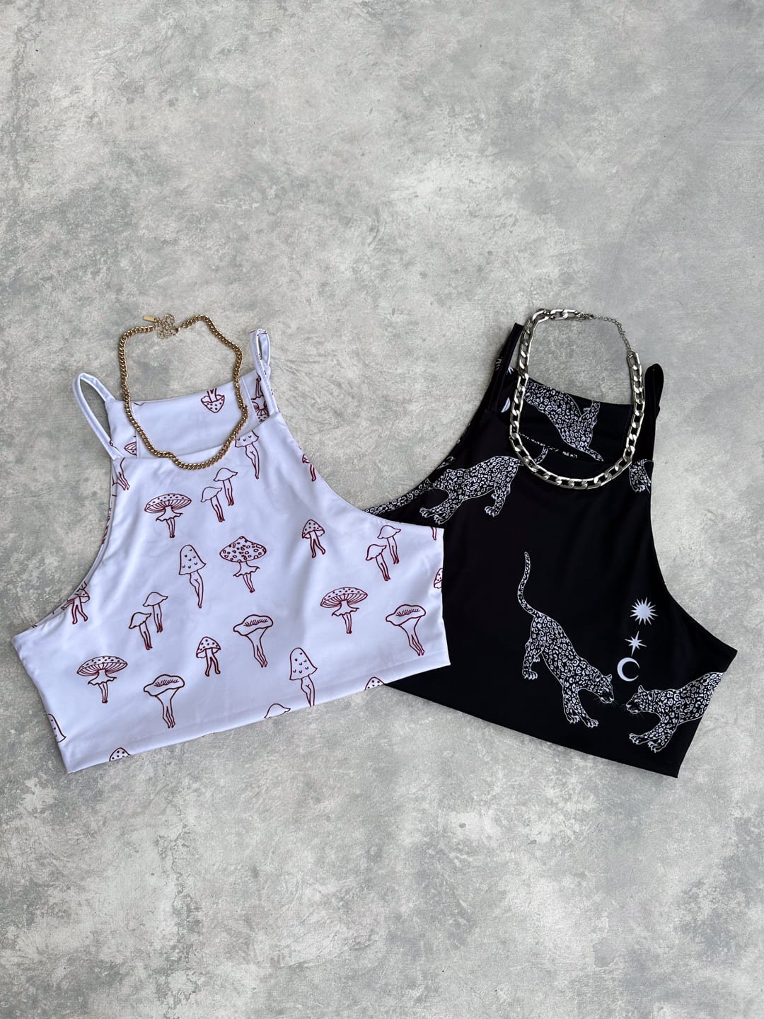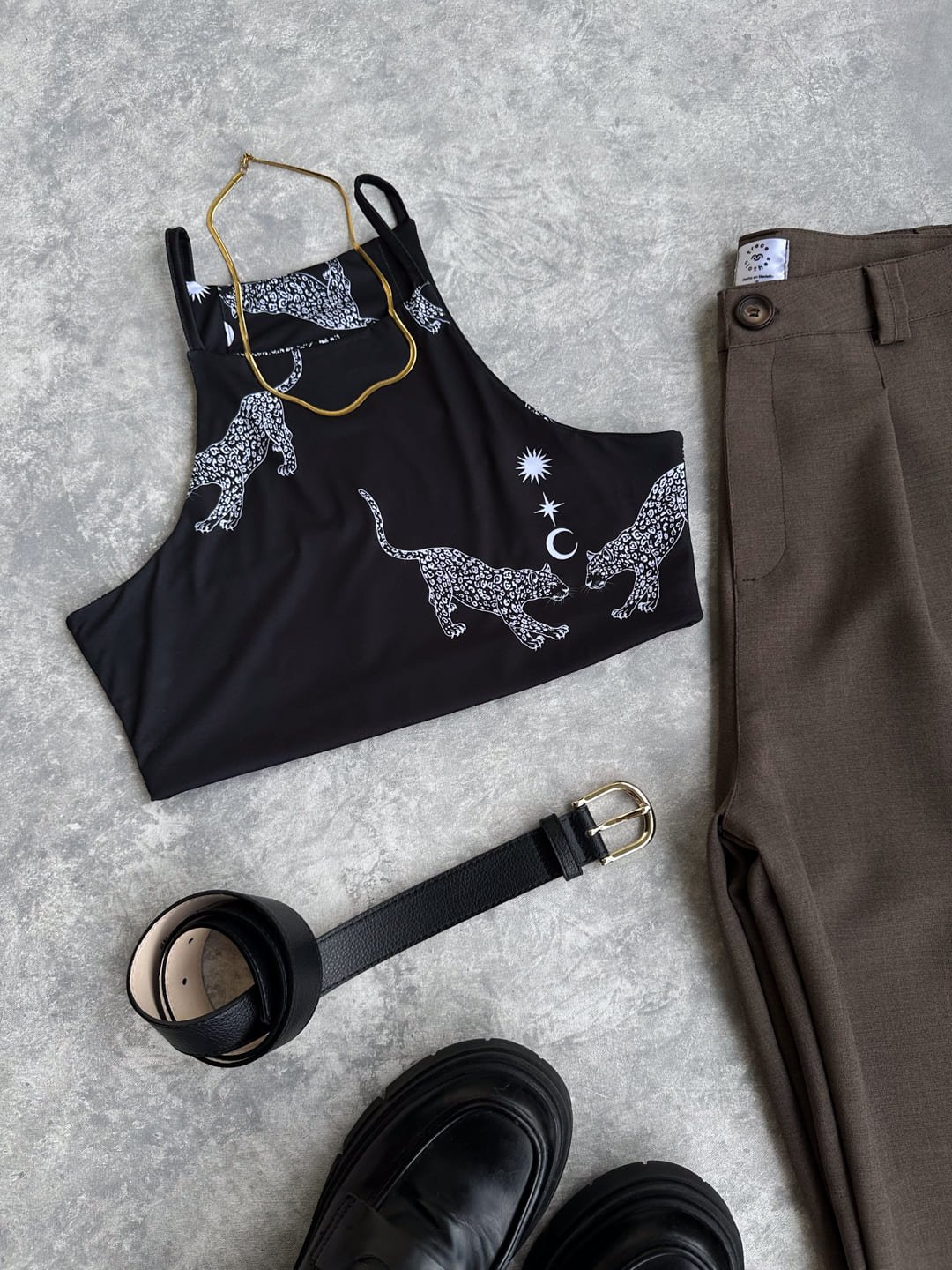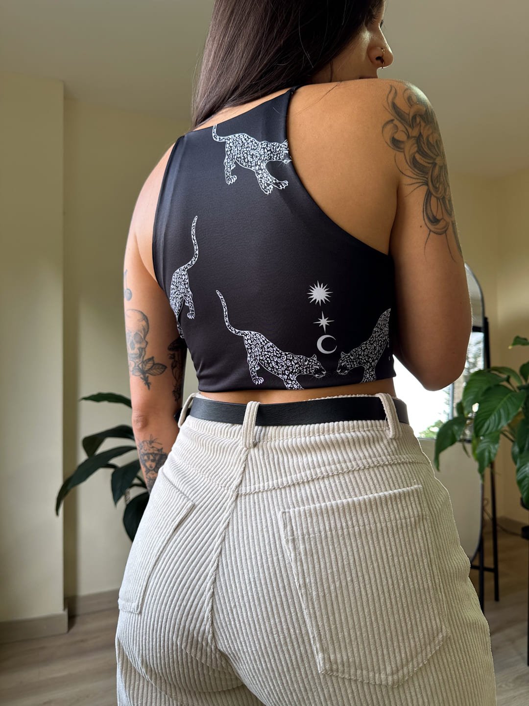 Croptop negro con print de jaguares, elaborado en lycra, tela doble en el frente y espalda, es una prenda básica, fácil de combinar, la tela es elástica, fresca, suave y cómoda. Ella usa S
