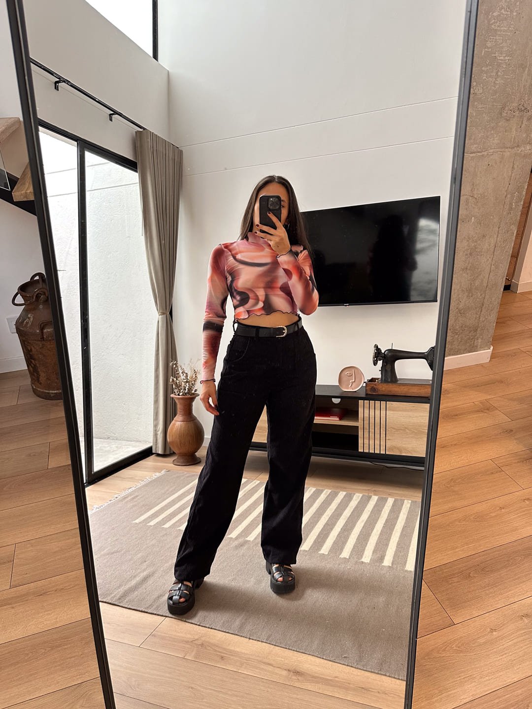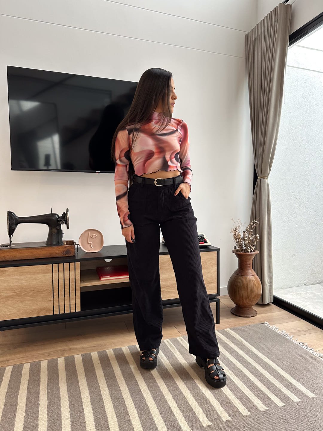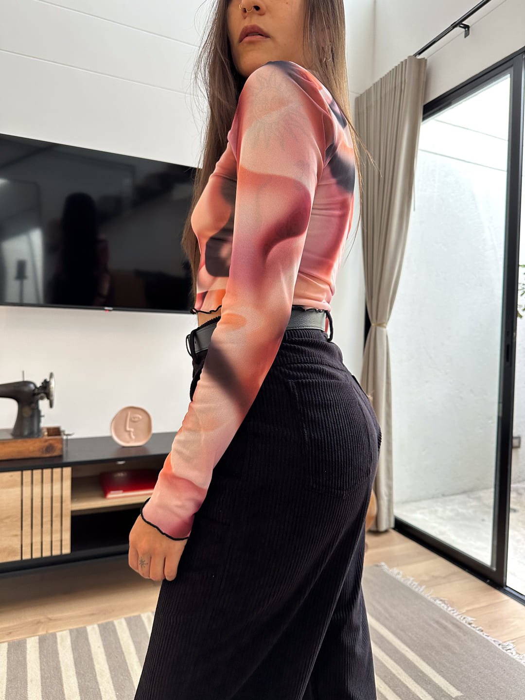 Croptop con print tiedye, elaborado en malla, manga larga de cuello alto, es una prenda básica, fácil de combinar, la tela es elástica, fresca, suave y cómoda. Ella usa S