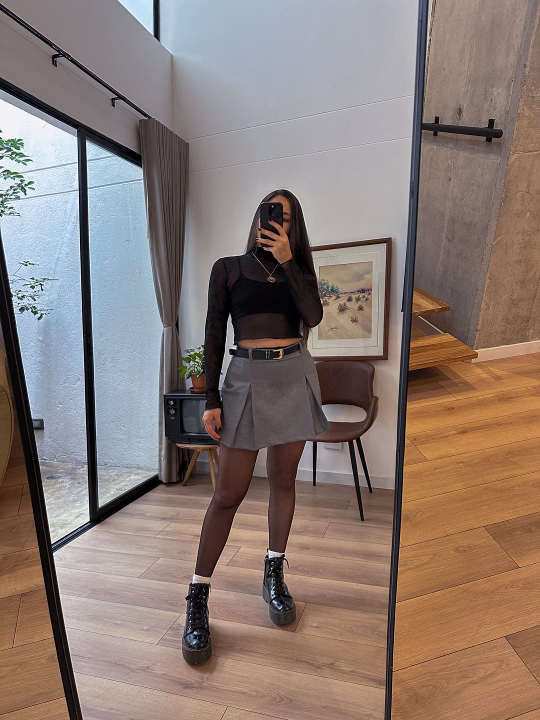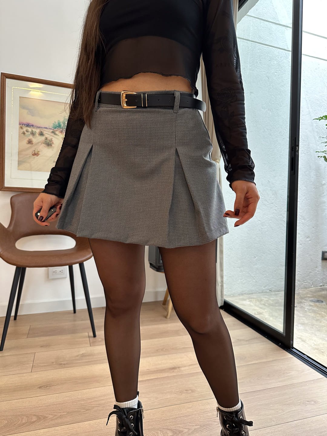 Falda short tiro alto, color gris con cuadros, elaborado en poliester, tiene dos pliegues delanteros, un cierre invisible en la parte de atrás, su pretina con pasadores, es una prenda básica fácil de combinar y super cómoda. La tela tiene poca elasticidad Ella usa talla S (1/2) 7