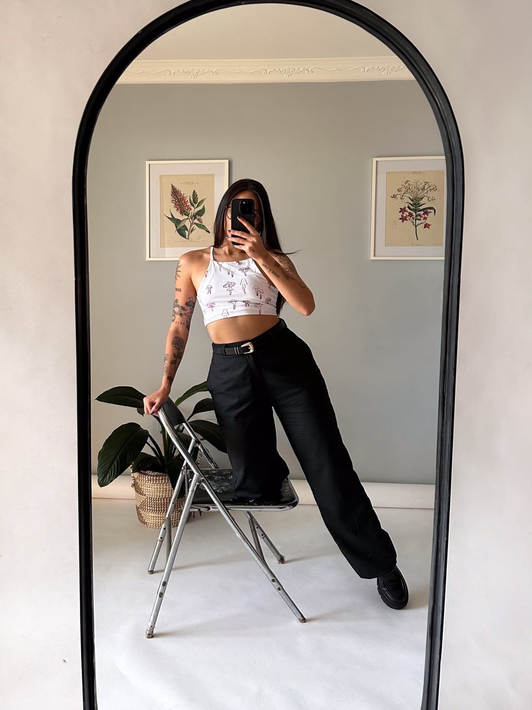 Pant tiro alto, color negro con cuadros, elaborado en poliester, bota ancha, tiene bolsillos laterales y traseros, es una prenda básica fácil de combinar y super cómodo. La tela es fresca y suave Ella usa talla S (1/2) 7