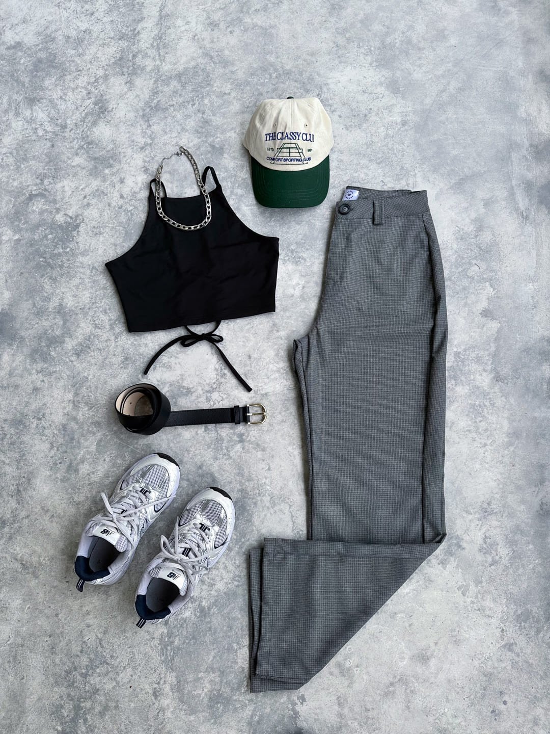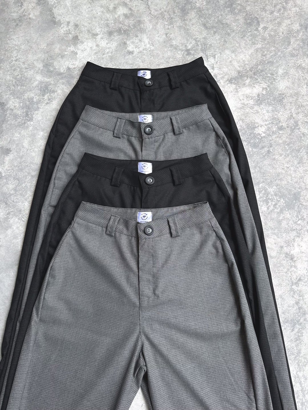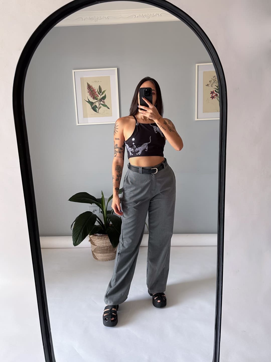 Pant tiro alto, color gris con cuadros, elaborado en poliester, bota ancha, tiene bolsillos laterales y traseros, es una prenda básica fácil de combinar y super cómodo. La tela es fresca y suave Ella usa talla S (1/2) 7