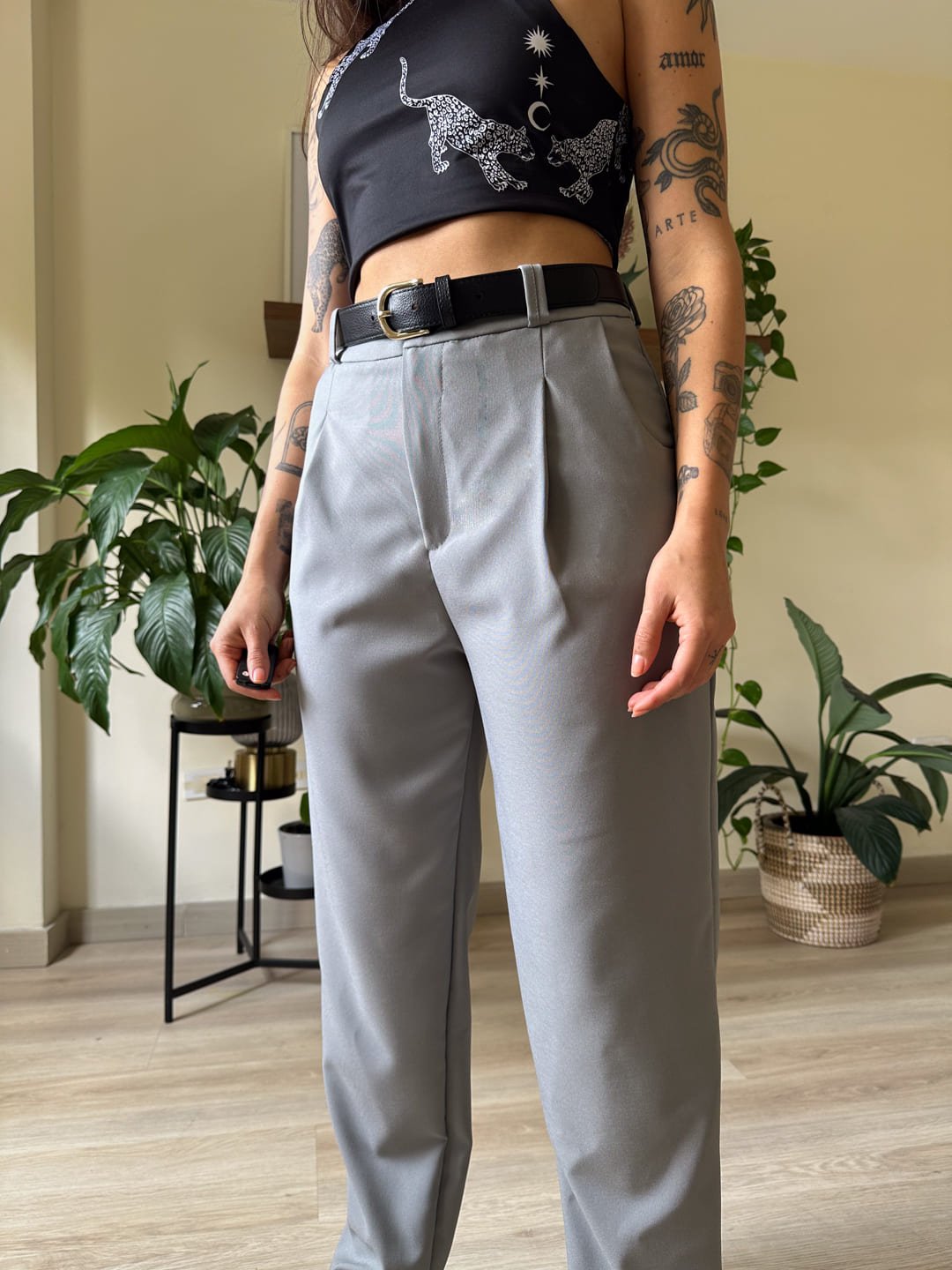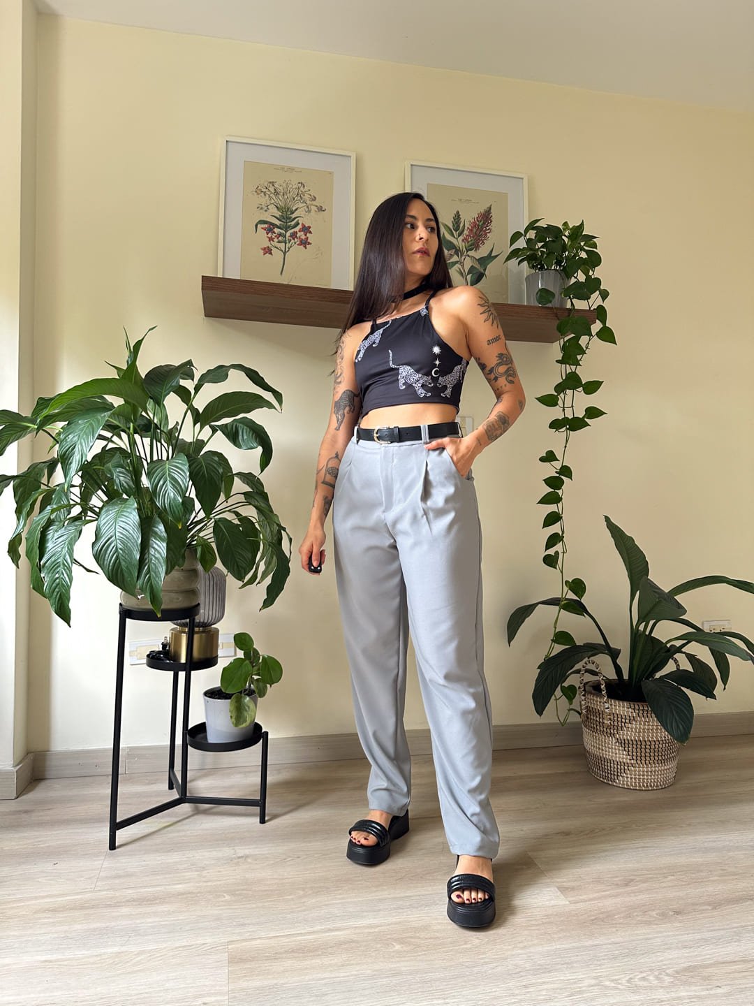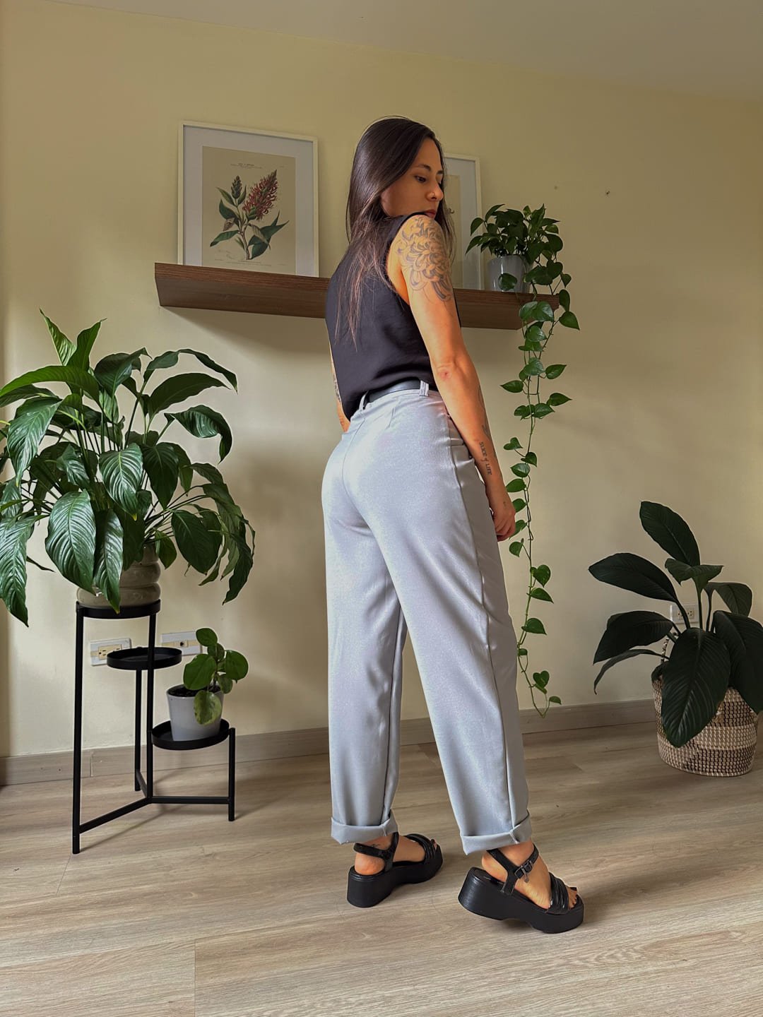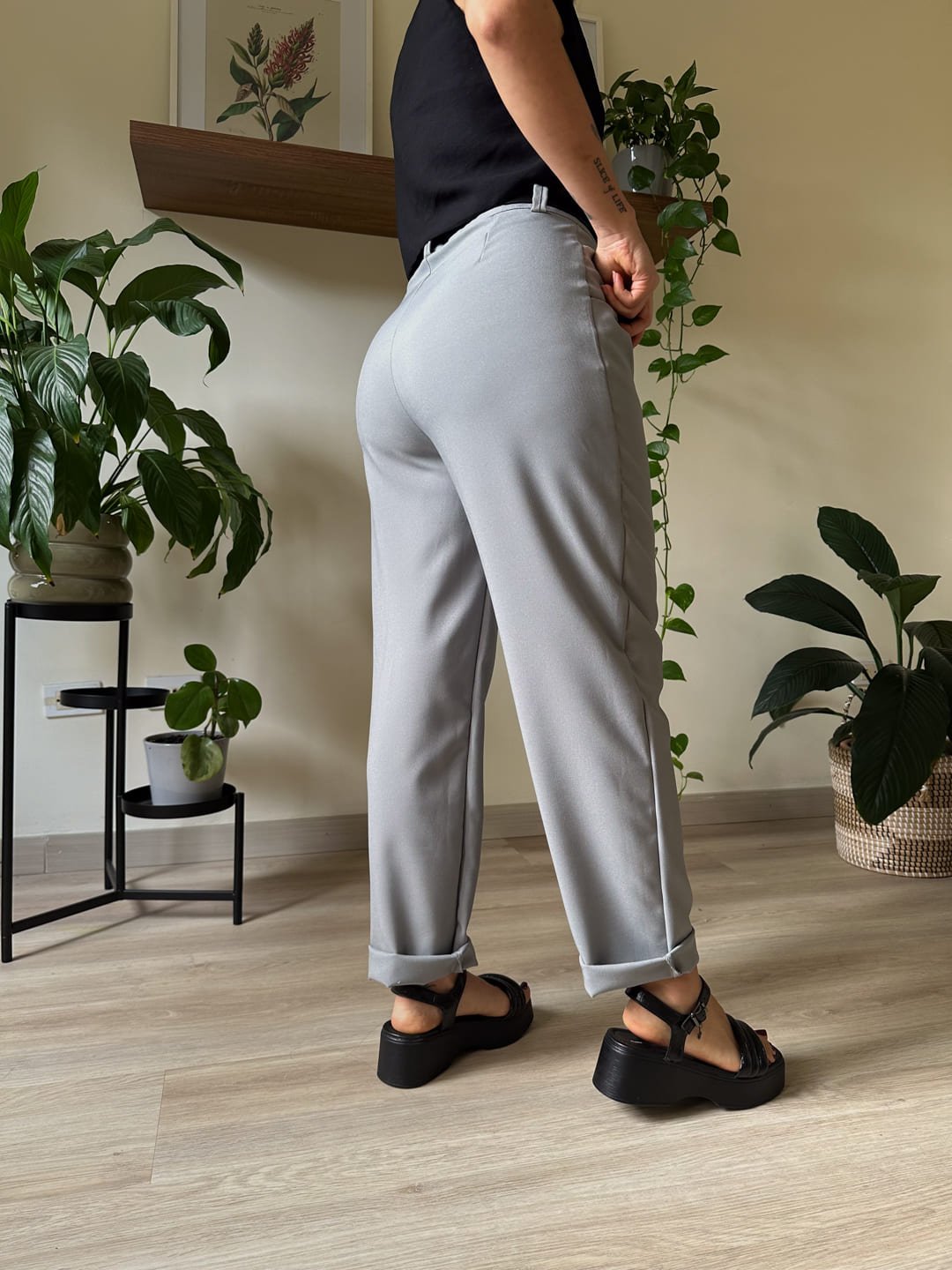 Pant tiro alto, color gris claro, elaborado en poliester, tiene bolsillos laterales con curva, es una prenda básica fácil de combinar  y super cómodo. La tela tiene poca elasticidad Ella usa talla S (1/2)  7