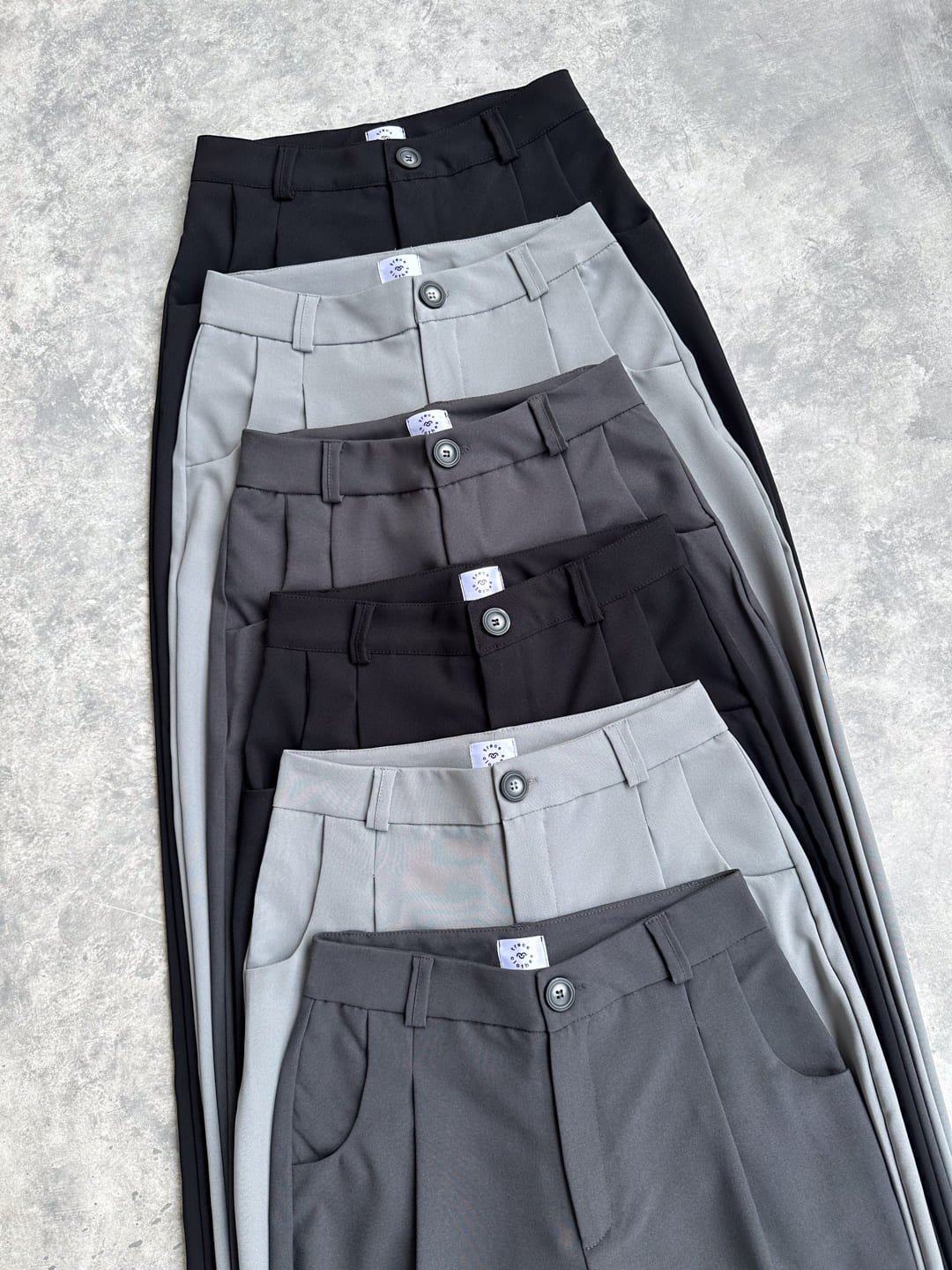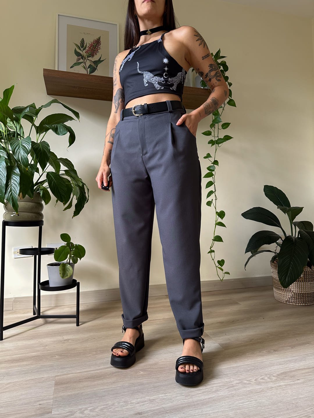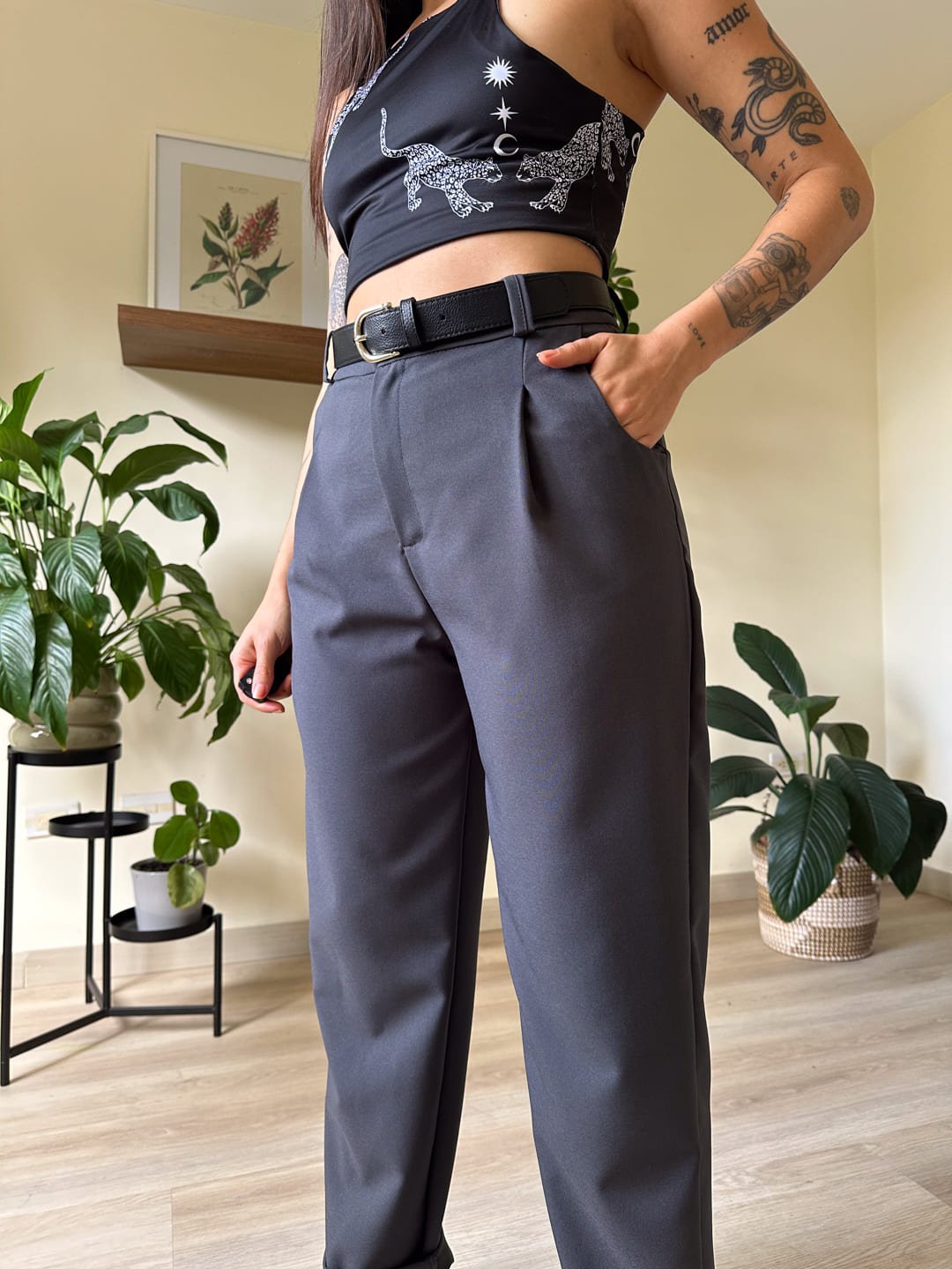 Pant tiro alto, color gris oscuro, elaborado en poliester, tiene bolsillos laterales con curva, es una prenda básica fácil de combinar y super cómodo. La tela tiene poca elasticidad Ella usa talla S (1/2) 7