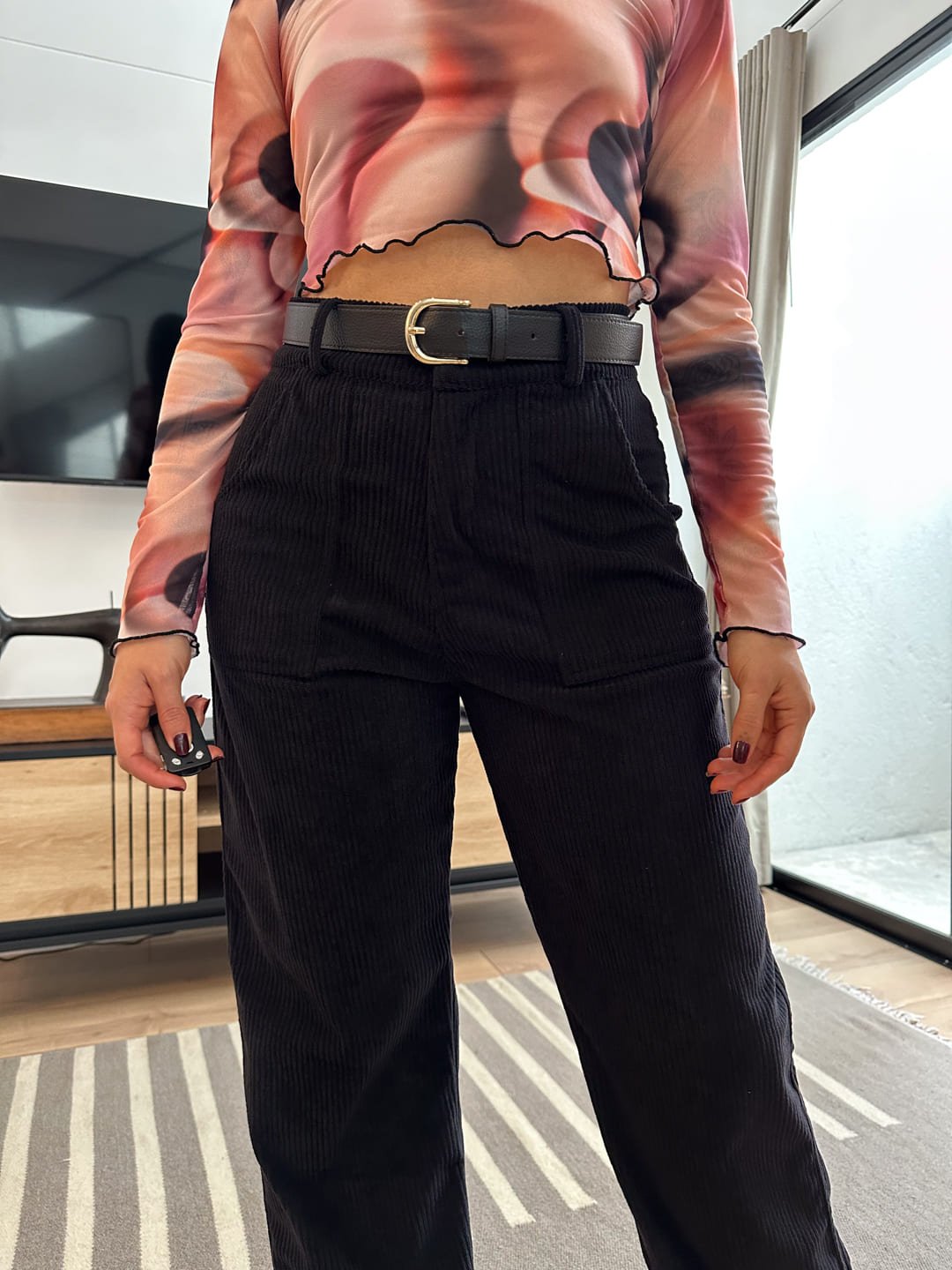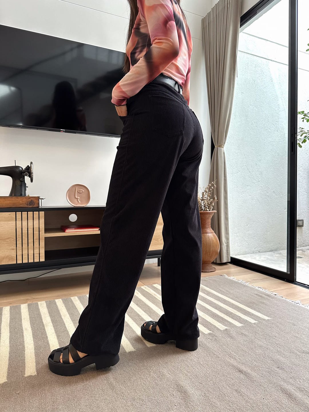 Pant tiro alto, color negro, elaborado en corduroy, tiene bolsillos delanteros y traseros, es una prenda básica fácil de combinar y super cómodo. Ella usa talla S (1/2) 7